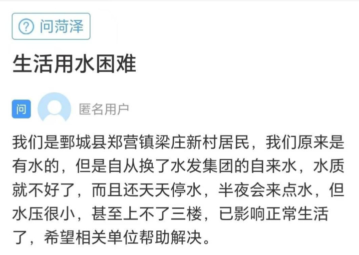 齐鲁网·闪电新闻12月31日讯菏泽的一位网友在闪电新闻网络问政平台留言说:我们是鄄城县郑营镇梁庄新村居民。自从换了水发集团的自来水,水质就不好了。而且还天天停水,半夜会来点水,但水压很小,甚至上不了三楼,已影响正常生活了。希望相关单位帮助解决。