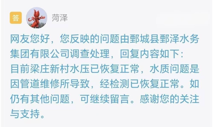 收到留言后,菏泽市鄄城县鄄泽水务集团有限公司进行了办理并回复,目前梁庄新村水压已恢复正常,水质问题是因管道维修所导致,经检测已恢复正常。如仍有其他问题,可继续留言。