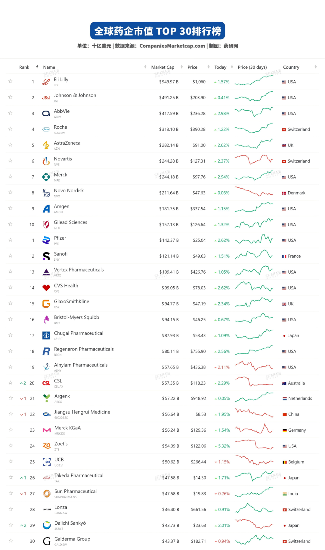 在这样的背景下,药研网团队整理制作了截至2025年11月21日的《全球制药企业市值 Top 30》完整榜单: