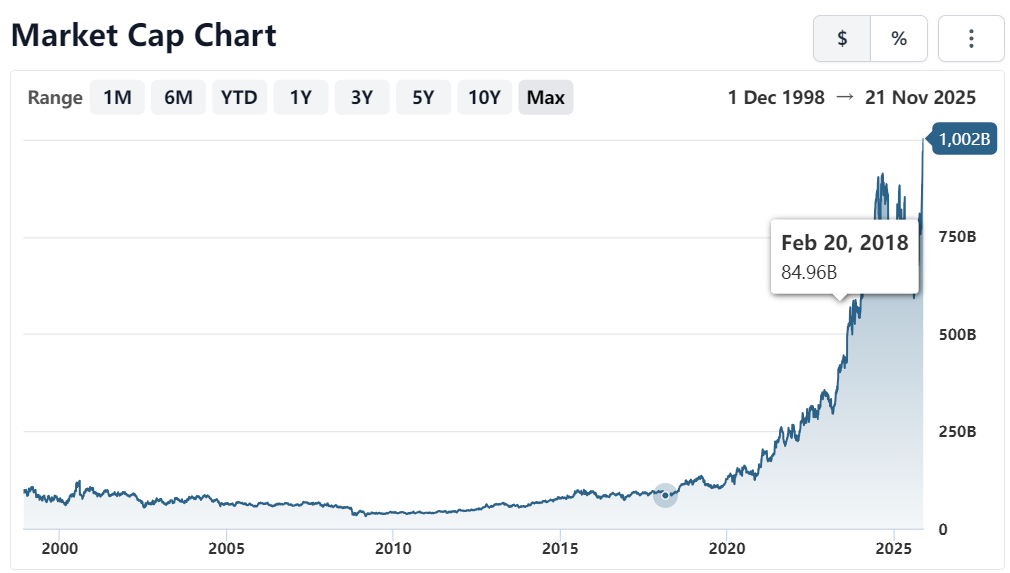 11月21日盘中交易时,股价一度触及约$1,061/ 股,市值“突破”1 万亿美元大关!尽管收盘时报1059.7,回落近9500亿美元,但这短暂的一瞬标志着全球制药行业正式进入了“万亿市值”的预备时代,也是美国除科技企业之外,第二家迈入这一门槛的公司。