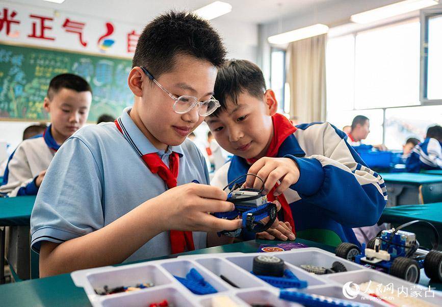 3月26日,呼和浩特市玉泉区通顺街小学机器人社团的学生在调试组装乐高机器人。丁根厚摄